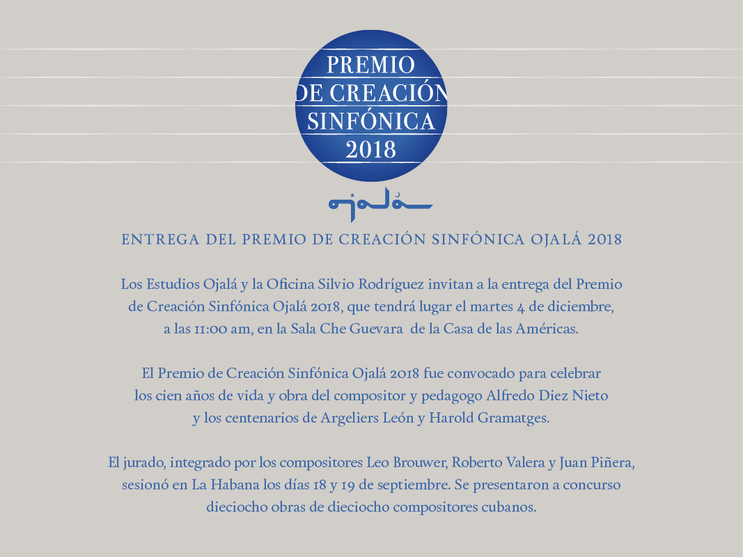 Los Estudios Ojalá y la Oficina Silvio Rodríguez invitan a la entrega del Premio de Creación Sinfónica Ojalá 2018, que tendrá lugar el martes 4 de diciembre, a las 11:00 am, en la Sala Che Guevara de la Casa de las Américas.
