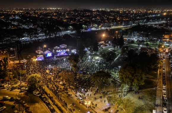 Es el edificio 8 en Villa Lugano, la azotea. Abajo es un mar de gente, pequeño en la distancia, desde la altura. Miles de luces minúsculas, las de la ciudad que se pierden en el horizonte, las de teléfonos que graban, que quieren capturar el instante. Desde esta perspectiva el concierto y toda la ciudad están en el mismo plano, en una diagonal negra estrellada.