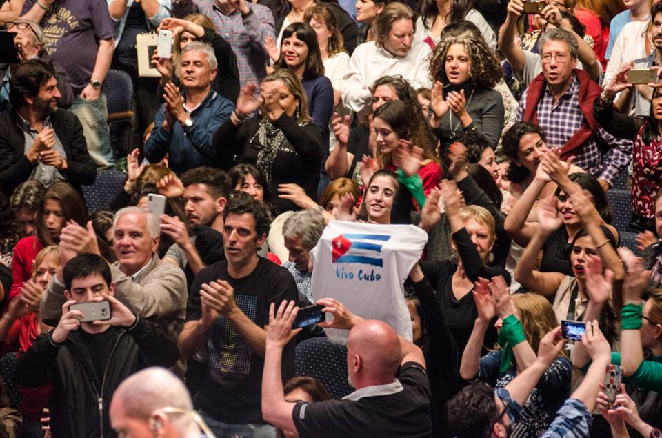 Con dos banderas, una del movimiento 26 de julio, que representa la histórica gesta cubana liderada por el líder histórico Fidel Castro que abrió el camino al triunfo revolucionario, y otra de Argentina, un joven, emocionado aplaudía sin parar y gritaba vivas a la isla caribeña.